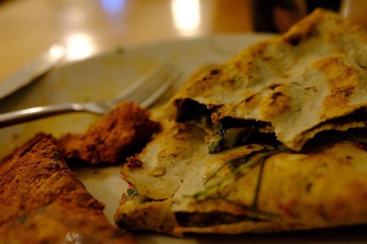 At Quince Letras I slowly sipped a Mojito, and for my entree I ordered Tlayudas – a Oaxacan specialty that I’d describe as a combination of pizza and a quesadilla. They include a toasted and folded tortilla stuffed with a balanced blend of cheese and veggies, with salsa served on the side. The entree additionally came with a choice of seasoned meat, which in this case was placed on top of the tlayuda. (I had more tlayudas during my trip, and it seems that meat is most often placed inside the tortilla).