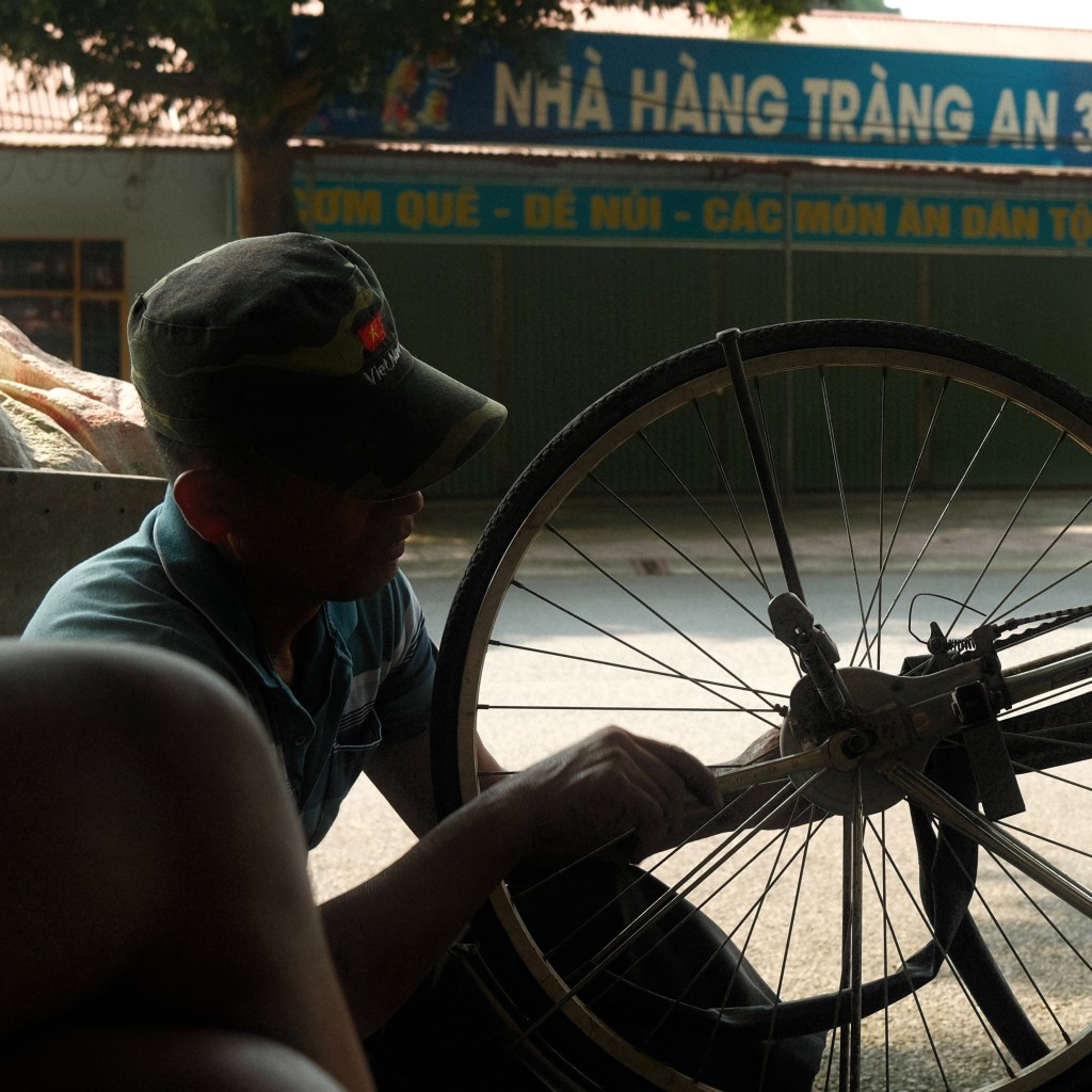 Near the end of my stay Brittany and I were out riding our bicycles when I realized mine had a flat tire. We had just eaten lunch at a restaurant nearby, and I thought they would be the best place to go and ask for help. There one of the owners’ children called a local repairman who arrived a short time later to fix the tire. After a quick inspection he took a stone and scratched “80” into the pavement, meaning 80,000 Vietnamese Dong, or $3.4 — to have it fixed. It was surprisingly mesmerizing to watch the bicycle undergo surgery right before our eyes!