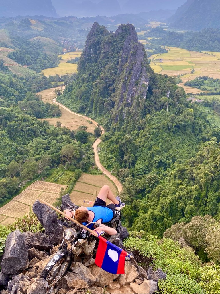 The area west of Vang Vieng has six Blue Lagoons, and I took my bicycle to the second one. The road became gravel and extremely bumpy the closer I got to the lagoon. It’s just part of the rustic charm of Laos, I kept reminding myself. The lagoons looked touristy from the signs along the road, but to my surprise the entrance fee was 10 Kip (50 cents) and there were mostly Lao tourists. I backed out of jumping into the lagoon from a 20 foot-tall platform, only to watch Lao people jump and even dive as I sat nearby. That afternoon I rode to the nearby Nam Xay viewpoint, where one could hike up and get their photo taken with a motorbike cemented in place (and a Lao flag) at the viewpoint. For my photo I opted to pose in a reclined position, as if I were sleeping — a common sight in SE Asia!