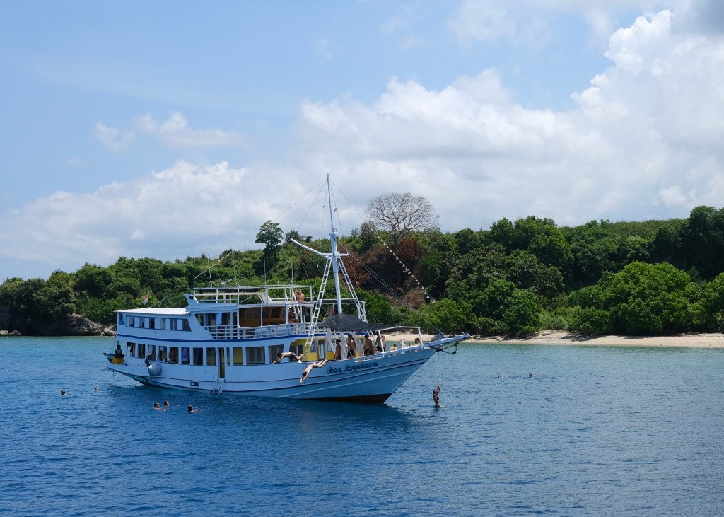 The tour was a bargain for what’s included: a 3-hour overland bus transfer to the ship, three meals per day, free coffee/tea, accommodation onboard in a covered deck or private cabin (a little more $$ for the latter), hours and hours of sailing views, entrance fees to Komodo National Park, and finally the opportunity to both swim with Whale Sharks and walk alongside Komodo Dragons in their natural habitat.