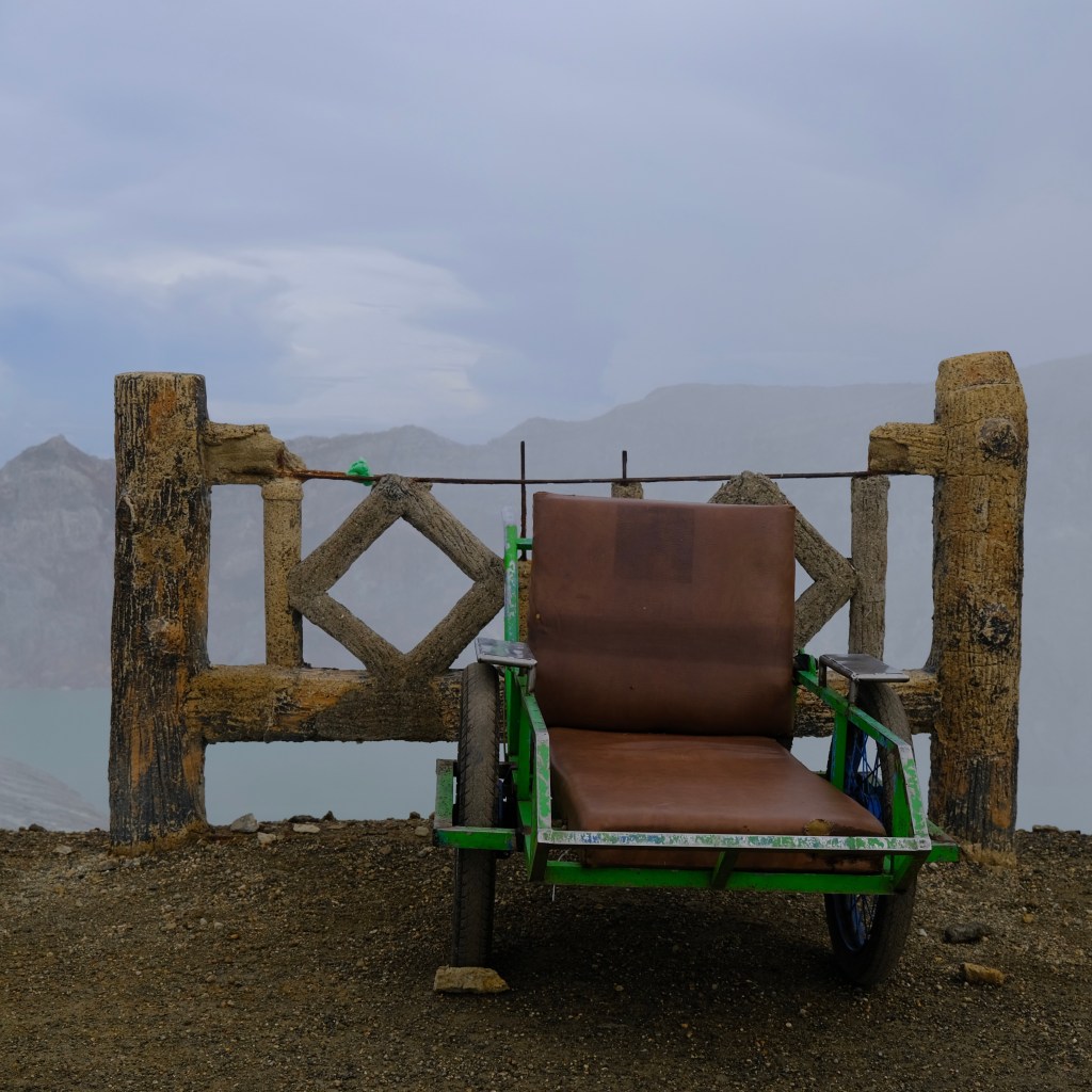 Once everyone had collected themselves we walked along the crater rim for views of the toxic green lake below. We watched as miners carried up large yellow blocks of sulfur. Meanwhile locals offered rides back down the volcano on what looked like a cross between a wheel-barrow and a wheel-chair. The views from the rim were only a slight consolation to the misery we had just experienced in the crater, yet the whole thing already felt like a crazy memory.