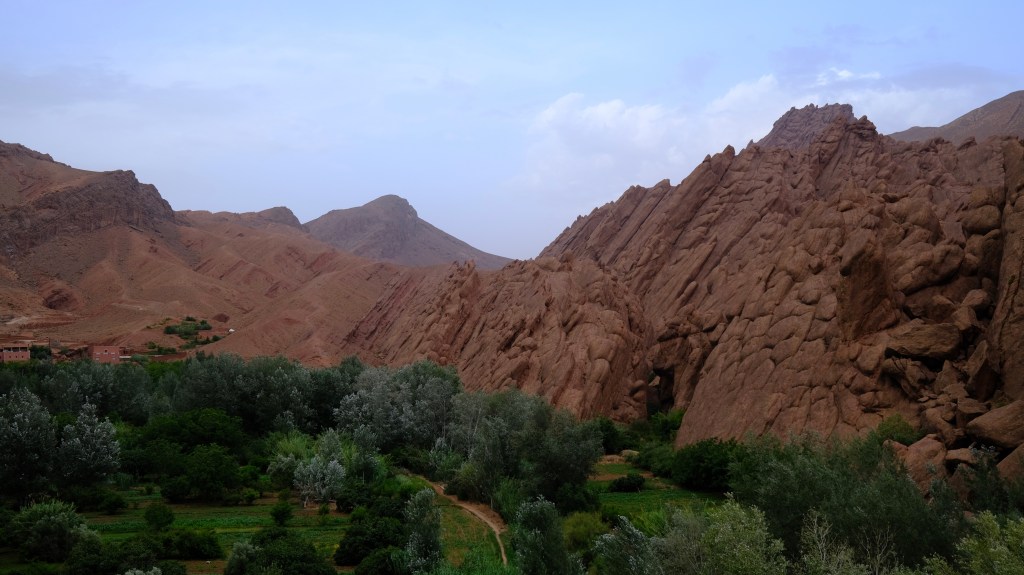 That first day was full of scenic driving – we passed over the Atlas Mountains, through the city of Ouarzazate, and onto the Dadès Gorge. At mid-day we stopped at the ancient town of Ait Ben Haddou, which has been heavily used in film and TV, including for Game of Thrones. A local guide brought us to a shop in the village to purchase head scarves for the Sahara. He taught us how to tie them, but I found the local method was too tight and actually made my head warmer, so I took to wrapping it loosely around the brim of my bucket hat.