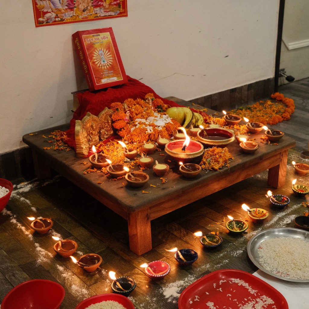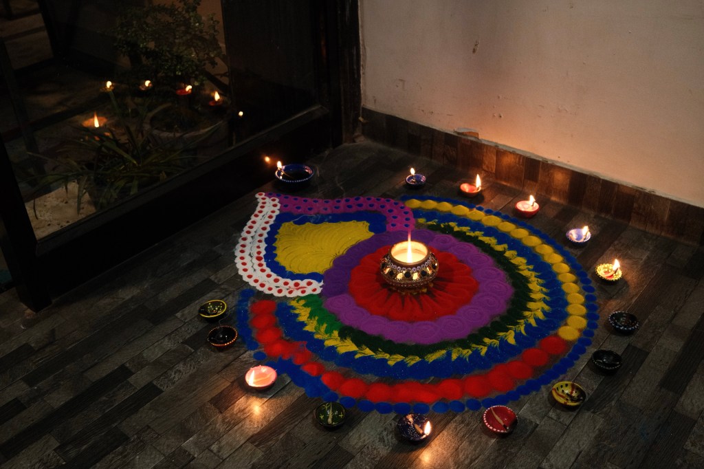 Along with seven European travelers from the hostel I took part in a Diwali ceremony with our hosts. This involved making offerings to the Hindu Gods for good luck and fortune. Imagine us, a bunch of clueless westerners sitting on the floor overtop of a white cloth — the manager of our hostel chanting in a hushed tone, then inviting each of us one by one to offer specs of rice, spice, and water to small dolls representing the Goddess Lakshmi and Lord Ganesha.